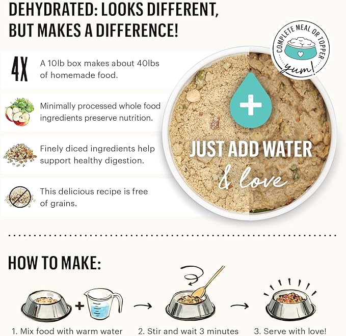 - EASY HOMEMADE: Just add warm water for a wholesome & delicious meal. Serve alone as a complete meal for maximum nutrition, or use as a topper to their dry food.