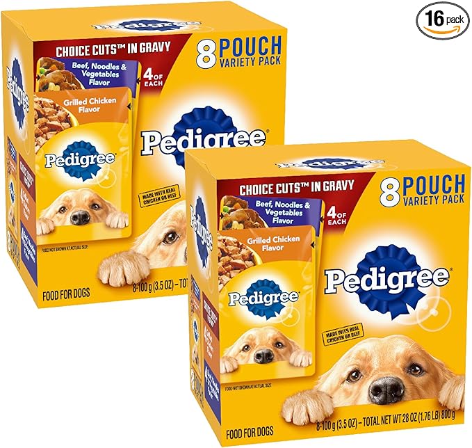- 16-Count: Pedigree Choice Cuts in Gravy Wet Dog Food 16-Count Beef, Noodles & Vegetables and Grilled Chicken Variety Pack contains eight (8) 3.5 oz. Pouches of Beef, Noodles & Vegetables and (8) Grilled Chicken Flavors