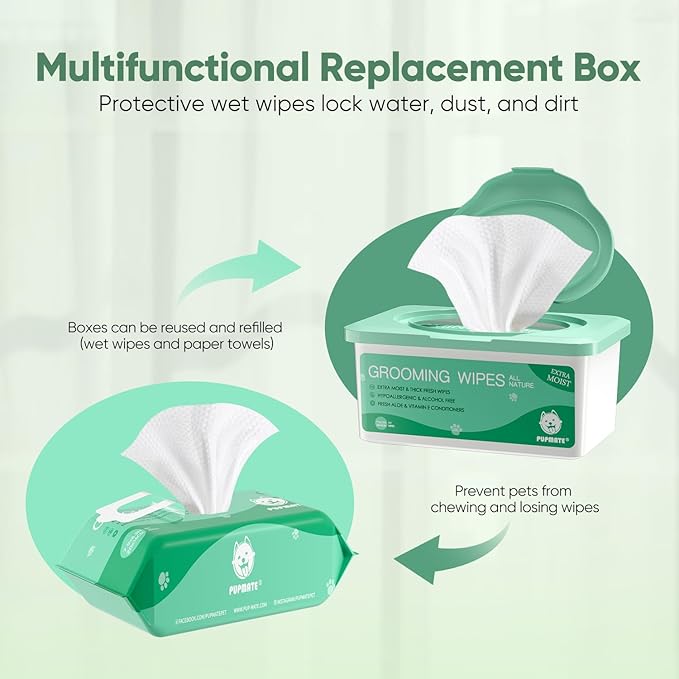 - CONVENIENT STORAGE AND DISTINCTIVE BOX DESIGN: The PUPMATE experience is about convenience, and our pet wipes exemplify this principle. Encased in a moisture-sealed box that shields them from dust and light, they're primed for use at a moment's notice. Be it your adventures outdoors or cozy moments at home, our dog wet wipes take on the role of unwavering protectors, an indispensable resource for your pet's joy