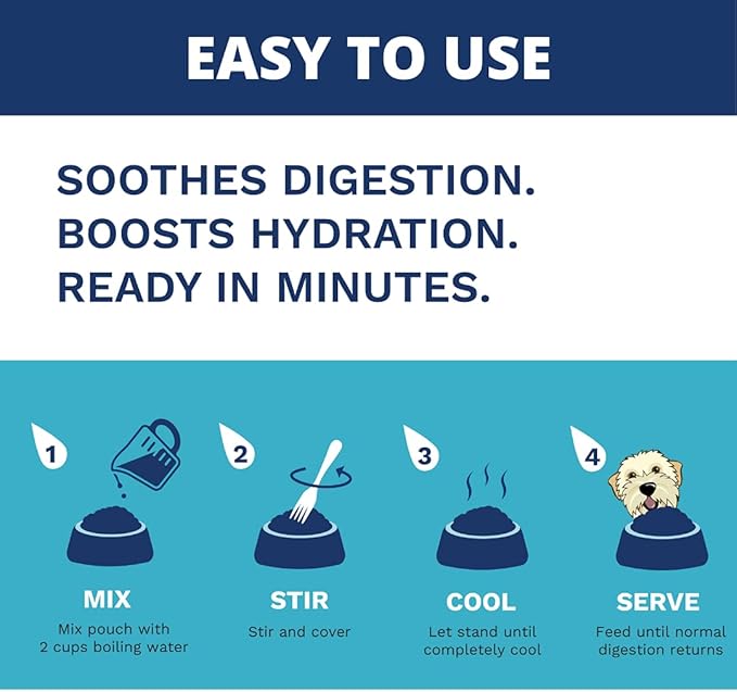 - NO MORE COOKING - JUST ADD WATER! When dogs experience digestive upset, including vomiting and diarrhea, vets recommend feeding a “bland diet” to soothe the digestive tract until normal digestion is restored.