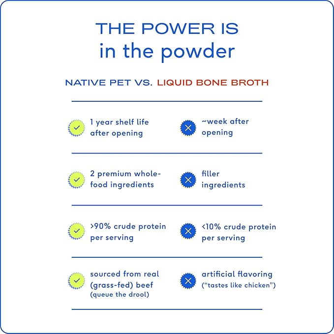 - Native Pet Promise: Our formulas use human-grade whole food ingredients with no fillers, making our products the top choice for your pet's health. Check out our dog bone broth powder and cat supplements for all life stages. Store at room temperature for freshness
