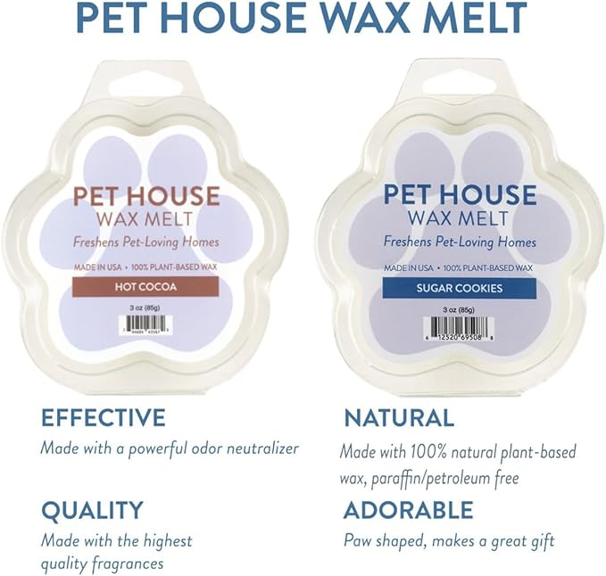 - Natural Wax for a Fresh Odor-Free Home: Fill your home with wonderful fragrances with our plant based scented wax melts. Pet House wax melts are specially formulated for pet loving homes. Sugar cookie wax melts are a sweet mix of vanilla, sugar, butter, with a dash of coconut, a delicious complement to our Hot Cocoa chocolate scented wax melt.