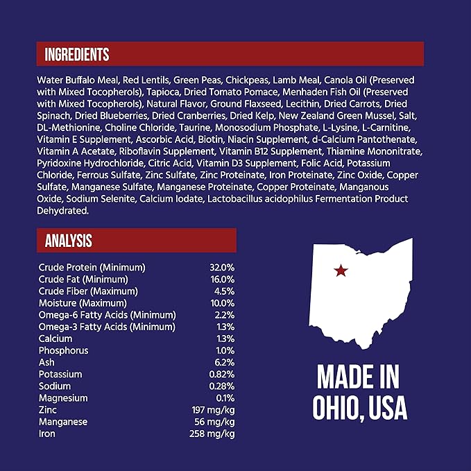 - NUTREINT-DENSE FORMULATIONS - A holistic blend of protein-rich buffalo and lamb, antioxidant-rich vegetables and probiotics for proper digestion Enriched with taurine