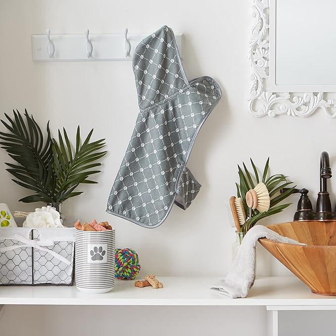 Bone Dry Pet Robe Collection, Trellis Paw Print, Absorbent Microfiber Bath Robe with Adjustable Closure for Dogs & Cats, Small, Gray