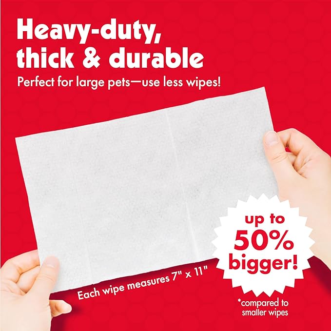 - Use Less Wipes - The 7 x 11 inch Big n' Thick wipes are larger than standard wipes, making them the smart choice for large pets and helps reduce how many wipes you need to use. Moistened with a gentle cleaning formula, and enriched with a soothing aloe to keep your pet's coat soft, shiny and smelling great.