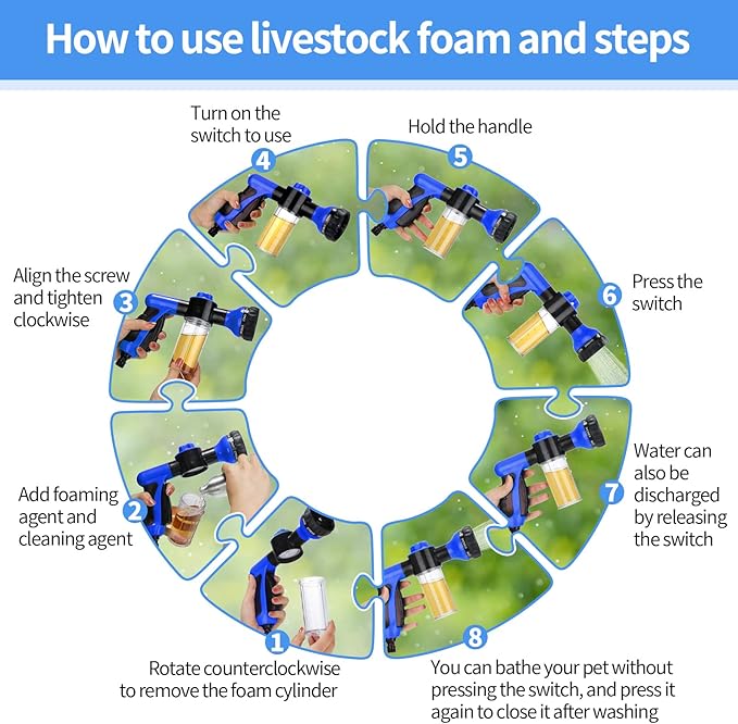 - Using method: wash your pets in five minute to gain a better cleaning effects; Just put desired foam shampoo to the container bottle, spray the foam on pets' body, give them a comfy massage, then rinse the foam off; For obtaining a better cleaning effect, please do not pre-wet your pets before using, because pre-wetting will interfere with the performance and reduce the shampoo's effectiveness; This pet bathing tool is suitable for most kinds of pets
