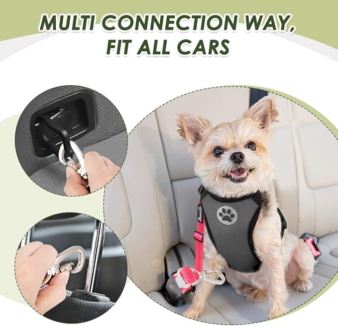 - Upgraded 2 In 1 Seatbelt --- SlowTon dog seatbelt has upgraded the connect seat belt to ensure universal fit for most of vehicles, by adding a lockable tangle-free carabiner. It can be hooked to latch bar or headrest rod when traditional safety belt is not compatible with car buckle socket