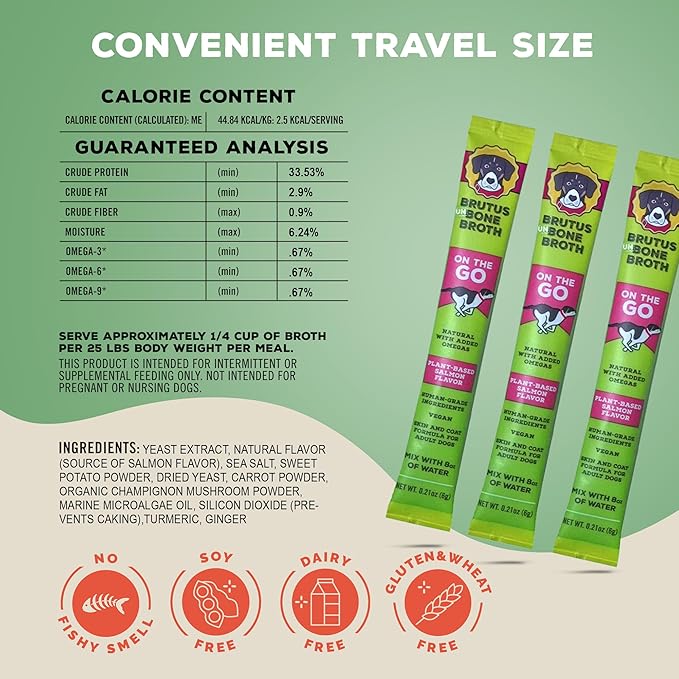 - The same vegetable broth taste your dog has come to know and love—now in a convenient travel size that’s perfect for when you’re on the go! Brutus Broth’s all natural vegetable dog food topper provides your dog with the vital nutrients they need while giving them a great tasting salmon flavor they’ll crave