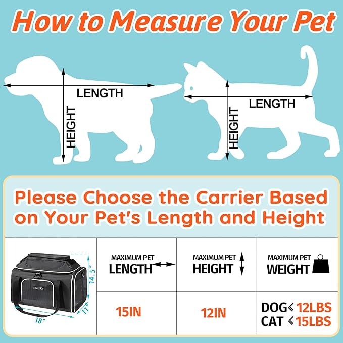 - 【CHECK SIZE BEFORE BUYING】In order to fit the under-seat dimensions of airlines, this carrier can only fit small dogs and cats. We recommend that the pet size you carry be within 15"L x 9"W x 12"H and weight under 12LBS. Please don't choose the carrier only based on weight but also reference your pet's length and height.