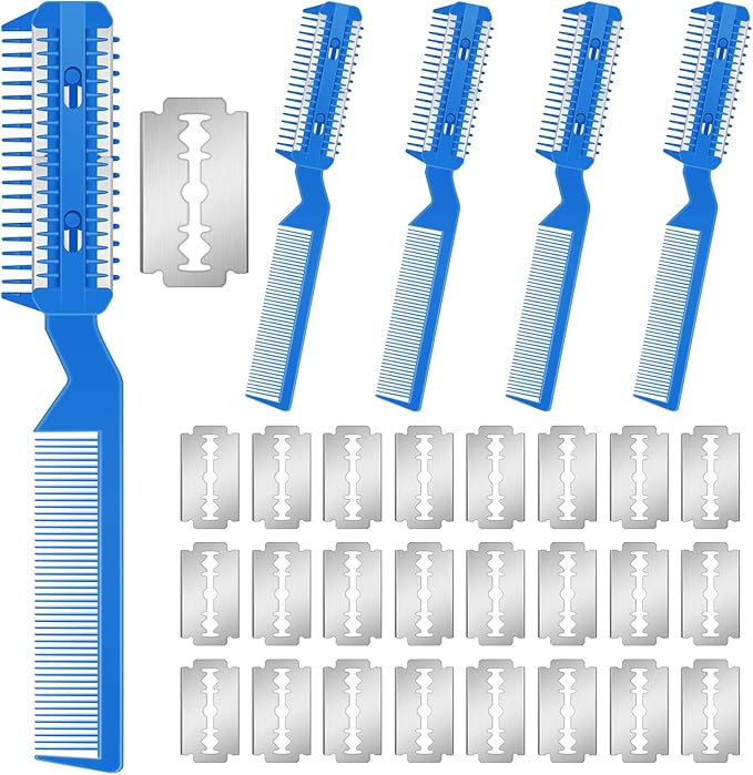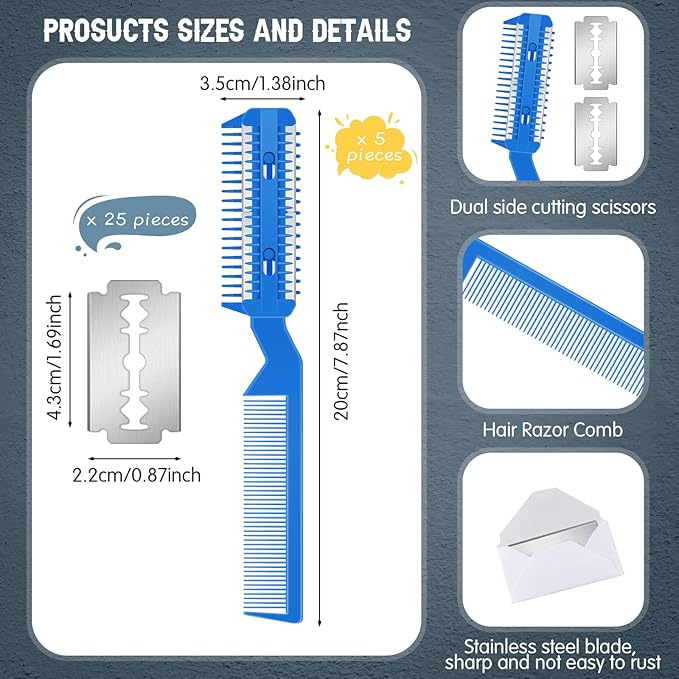 Yinkin 5 Pieces Razor Comb for Dogs Hair Grooming Trimmer for Pet Razor Comb with 25 Extra Blades Manual Dog Hair Trimmer Double Edge for Cats Hair Cutting Tool(Blue)