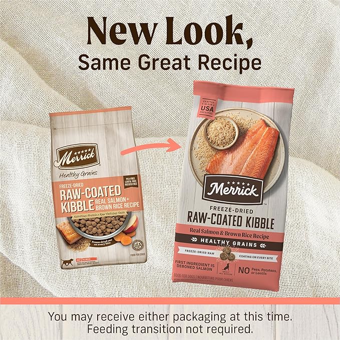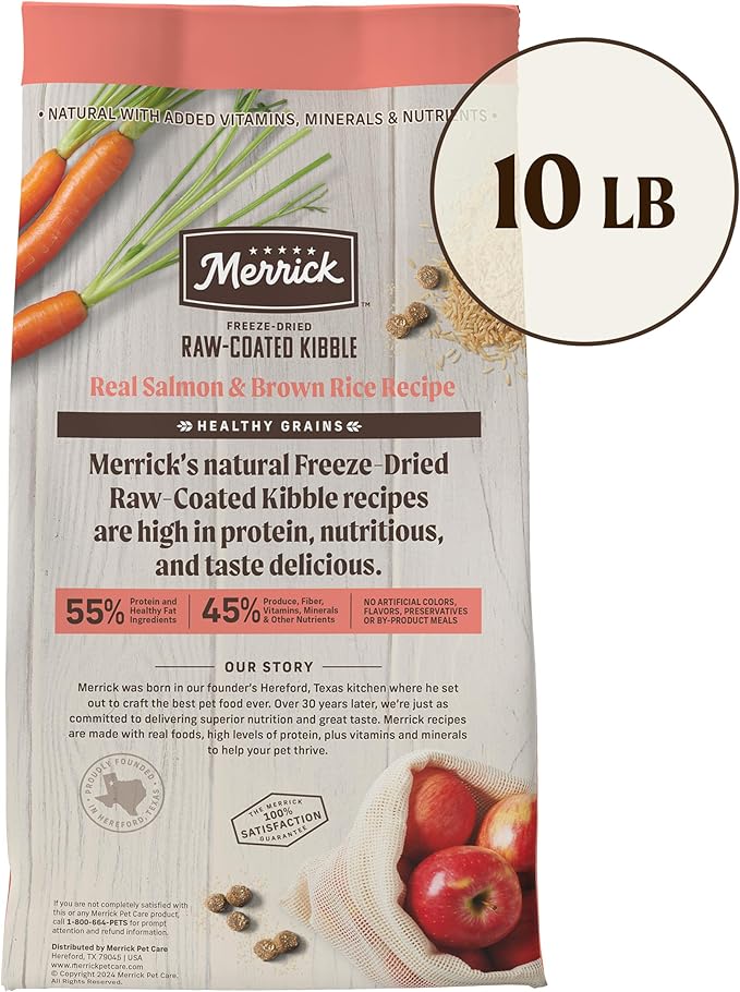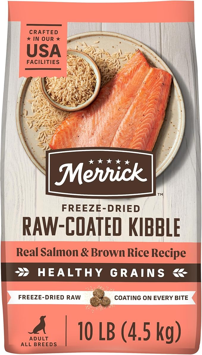 - Merrick Healthy Grains Freeze Dried Raw Coated Kibble, Salmon And Brown Rice Recipe, Natural With Added Vitamins And Minerals High Protein Adult Dry Dog Food
