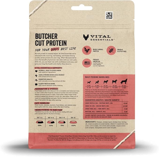 - FREEZE-DRIED RAW CHICKEN DOG FOOD: Vital Essentials Freeze Dried Dog Food packs more protein than industry standard into every bite to deliver the peak vitality your dog deserves, especially when compared to dehydrated dog food. Our complete and balanced freeze-dried raw dog food is high in butcher cut premium cage-free chicken, responsibly sourced in the USA.