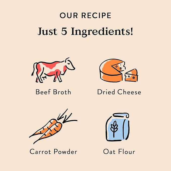 - Perfect for everyday eating: With just 5 ingredients (beef broth, dried cheese, carrot powder, oat flour and flax), you can feel good supplementing your pup’s favorite dog food with this yummy recipe