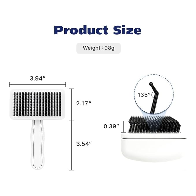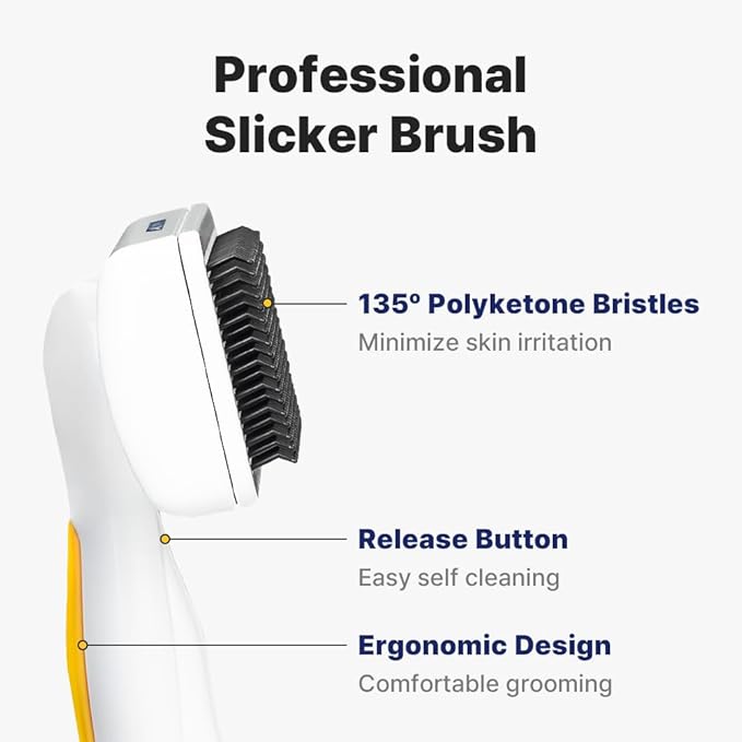 - STURDY & GENTLE BRISTLES: Made with durable Polyketone bristles featuring a protective coating and soft, rounded tips to prevent scratching sensitive skin. Angled at 135 degrees, these bristles efficiently detangle fur, reduce shedding, and massage your pet’s skin, promoting a shinier, healthier coat.