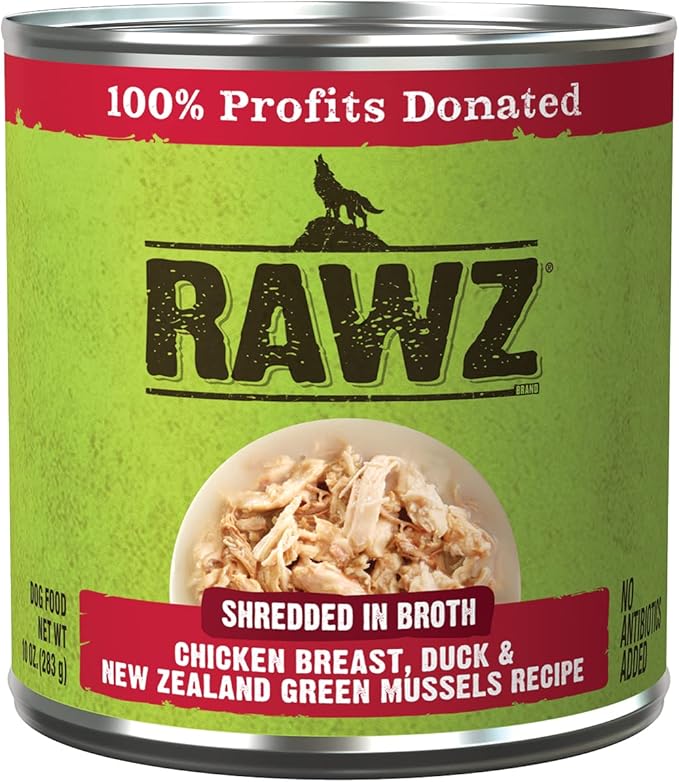 Rawz - in Broth Canned Adult Dog Food (Shredded Chicken in Broth) with New Zealand Green Mussels - 12 Cans -10 OZ Cans (Chicken&Duck-Shredded)
