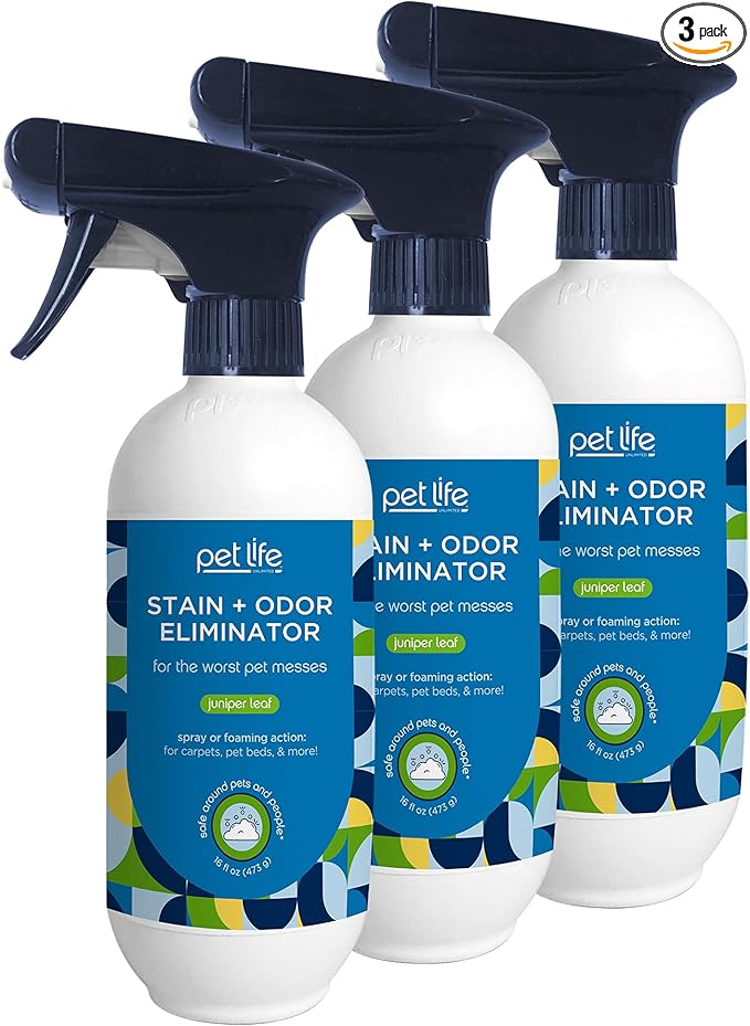 Pet Life Unlimited Foaming Stain + Odor Eliminator Spray Cleaner - Plant-Based Stain Removal - Two-Way Spray Applicator - Natural Juniper Leaf Scent - Made in the USA - 16 Ounce (Pack of 3)