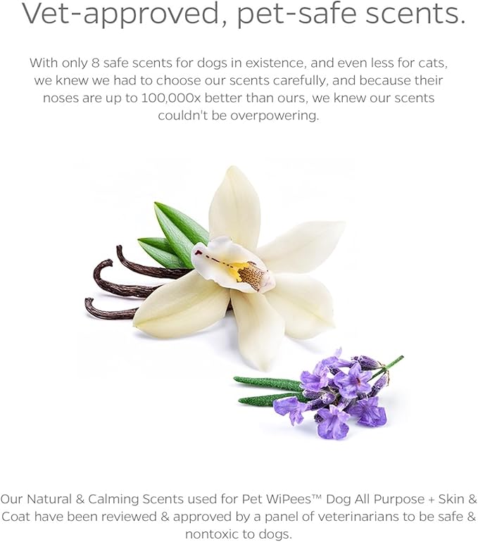 - VET-APPROVED, PET-SAFE SCENTS: When there are only 8 scents in the world that are safe for dogs, and even less for cats, we knew we had to have the safest scents that furbabies wouldn't turn their nose up at. Our scents have been reviewed and approved by a panel of veterinarians to be safe, nontoxic, and non-irritating for both dogs and cats. Just enough in our formulas to smell good, the scents in these paw wipes for dogs are not enough to upset sensitive sniffers.