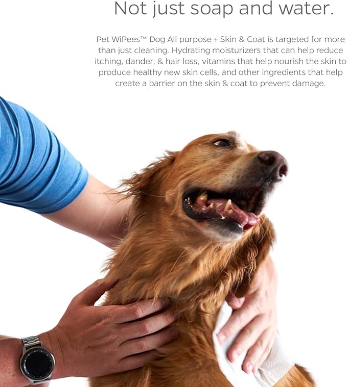 - TARGETED, BIO-BASED INGREDIENTS: Skin issues are the most common ailments our pups face. More than just soap and water, Pet Wipees Dog All Purpose + Skin & Coat are dog wipes formulated with target ingredients that can help prevent against irritants while moisturizing the skin and smoothing the coat. Ingredients like salmon oil for dogs, vitamin B complex, and keratin work together to promote healthy skin cell growth, repair the coat, and help to reduce dander.