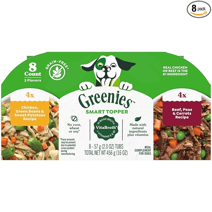 - Contains four (4) 2.0 oz. trays of Greenies Smart Topper Wet Mix-In for Dogs-Chicken, Green Beans & Sweet Potatoes and four (4) 2.0 oz. trays of Greenies Smart Topper Wet Mix-In for Dogs Beef, Peas and Carrots both in Vitabroth
