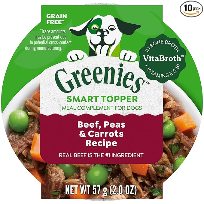 - Contains ten (10) 2.0 oz trays of Greenies Smart Topper High Protein Wet Mix-In for Dogs, Beef, Peas & Carrots Recipe In Vitabroth Broth - Bone Broth + Vitamins E & B1.