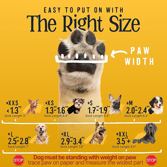 - XXL fits paws 2.5" - 2.8". Measure while dog is standing with weight on paw. Includes 4 dog grip socks. Snug fit is normal—extra grip makes them stiffer than other socks but provides better traction.