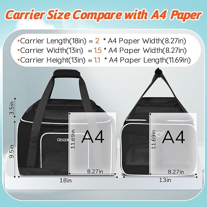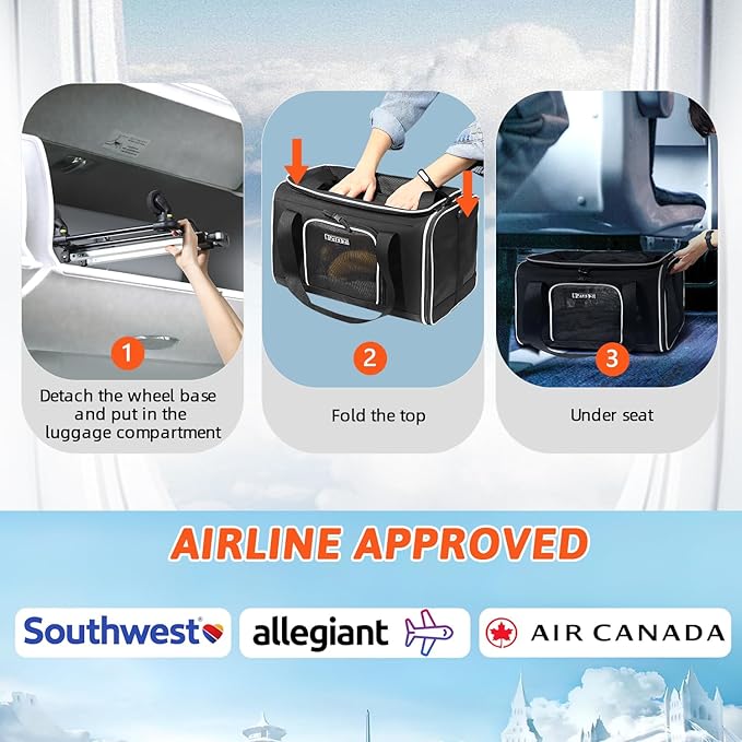 - 【AIRLINE APPROVED CARRIER 】Unfolded size:18"L×13"W×(9.5+3.5)"H, Petskd pet carrier is TSA approved and can be placed under the seat in the cabin(after remove the wheel base), it is mainly designed for ①Southwest Airlines②Allegiant Airlines, but also in compliance with ②Air Canada". We recommend you buy this carrier when you fly with the above-mentioned airlines.
