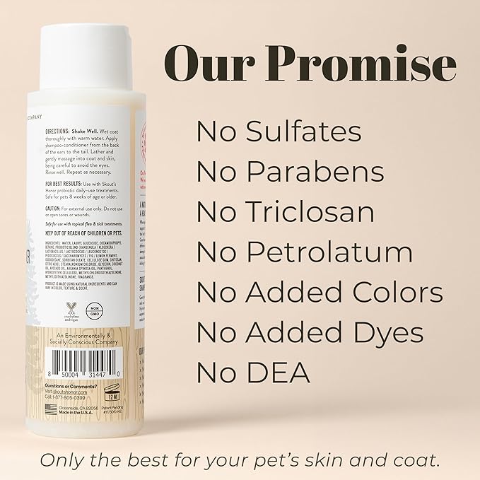 - Premium Grooming Experience - Skout's Honor pet shampoo and conditioner gently cleans and hydrates your pet's skin and coat, leaving fur silky and smooth.
