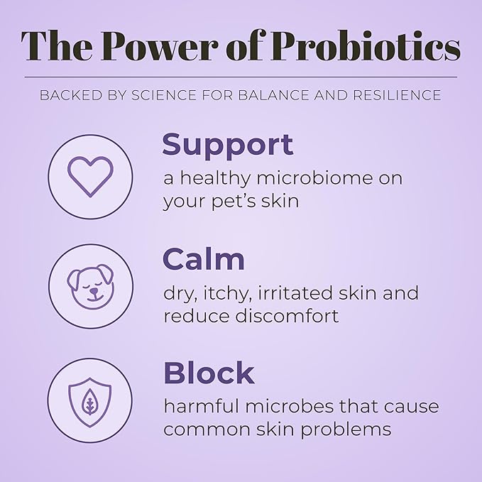 - Probiotic Formula- Each bottle contains topical probiotics that help support a healthy microbiome to defend against common skin problems such as itching, odor, dryness, dandruff, hot spots, and excessive shedding.