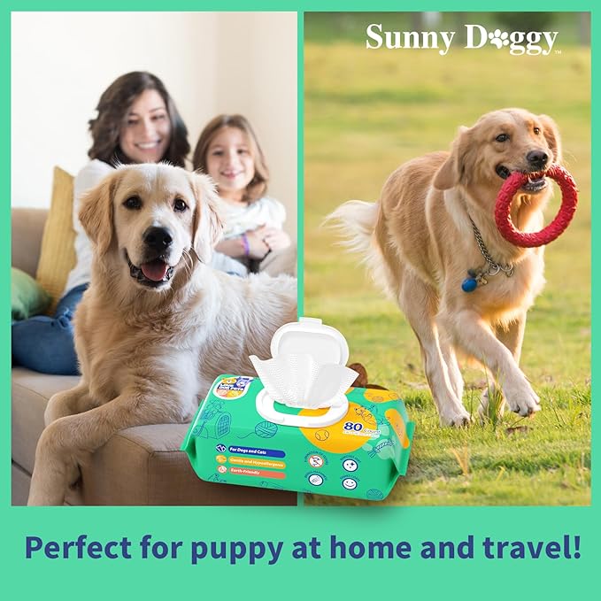 - PET WIPES FOR DOGS AND CATS: Sunny Doggy Pet Wipes are the ones that not only deodorize effectively, but also clean stains from your pet quickly and easily. The pet cleaning wipes can be used on your pet's butt, paws, ears, fur and around the eyes. Very gentle on pets.