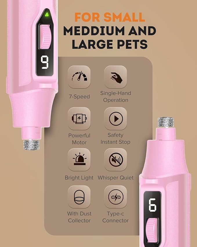 - INCLUDES DUST COLLECTOR: No more mess! The dog nail grinder features a built-in dust collector to keep nail filings contained, providing a tidy grooming session for both you and your pet.
