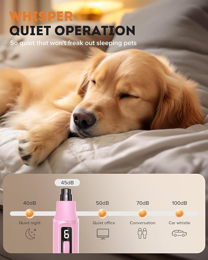 - WHISPER-QUIET OPERATION: Operating at only 45dB—roughly the noise level of a refrigerator—this dog nail grinder ensures a calm, quiet grooming experience without startling your furry friend.
